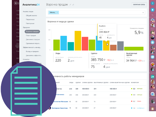 Все в курсе дел, вы не тратите время на сбор разрозненных данных от десятка менеджеров, сразу же видите слабые места, если они есть, и оперативно с ними разбираетесь.